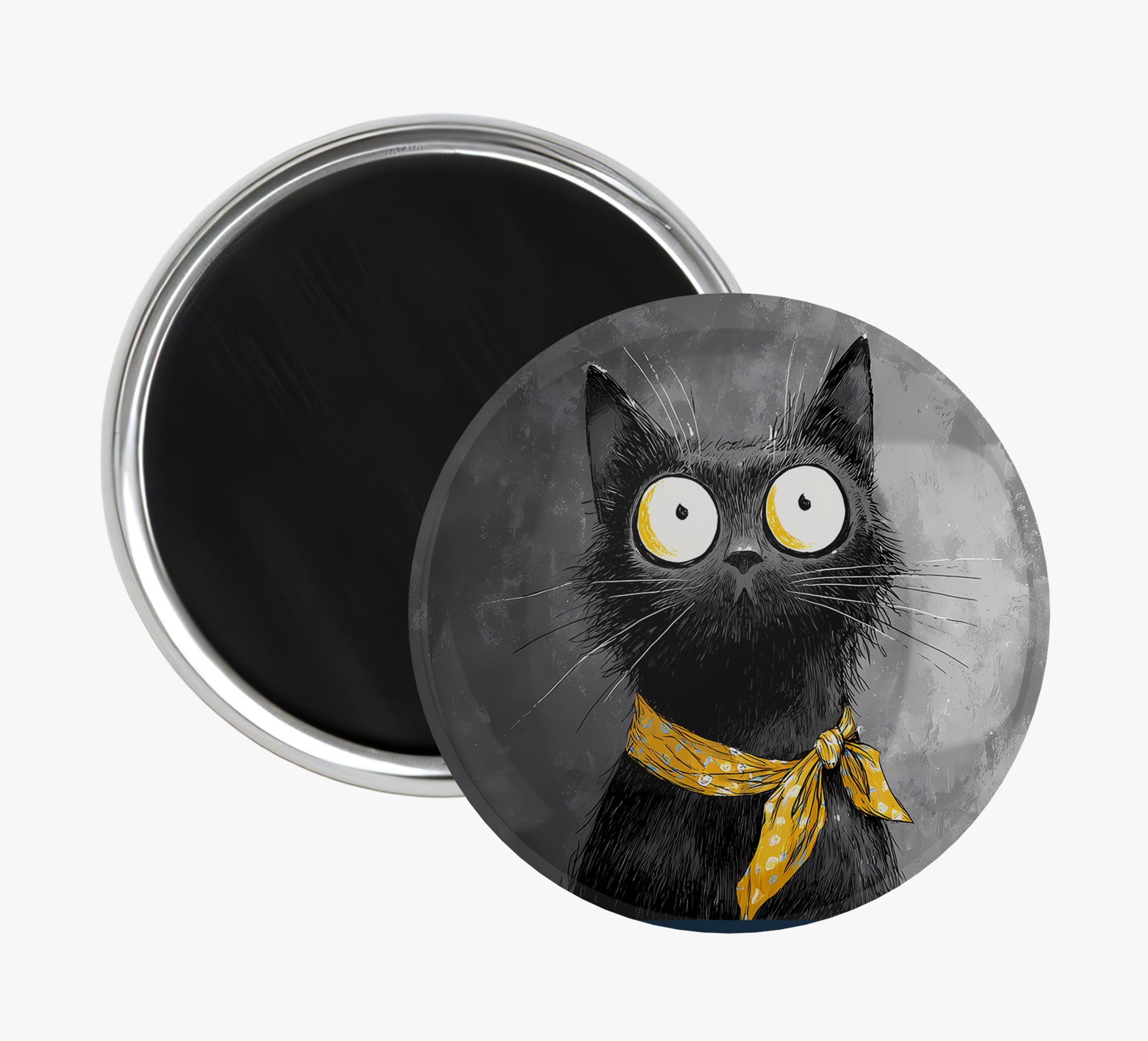 Wide-eyed black cat with a yellow scarf in a dark artistic design.